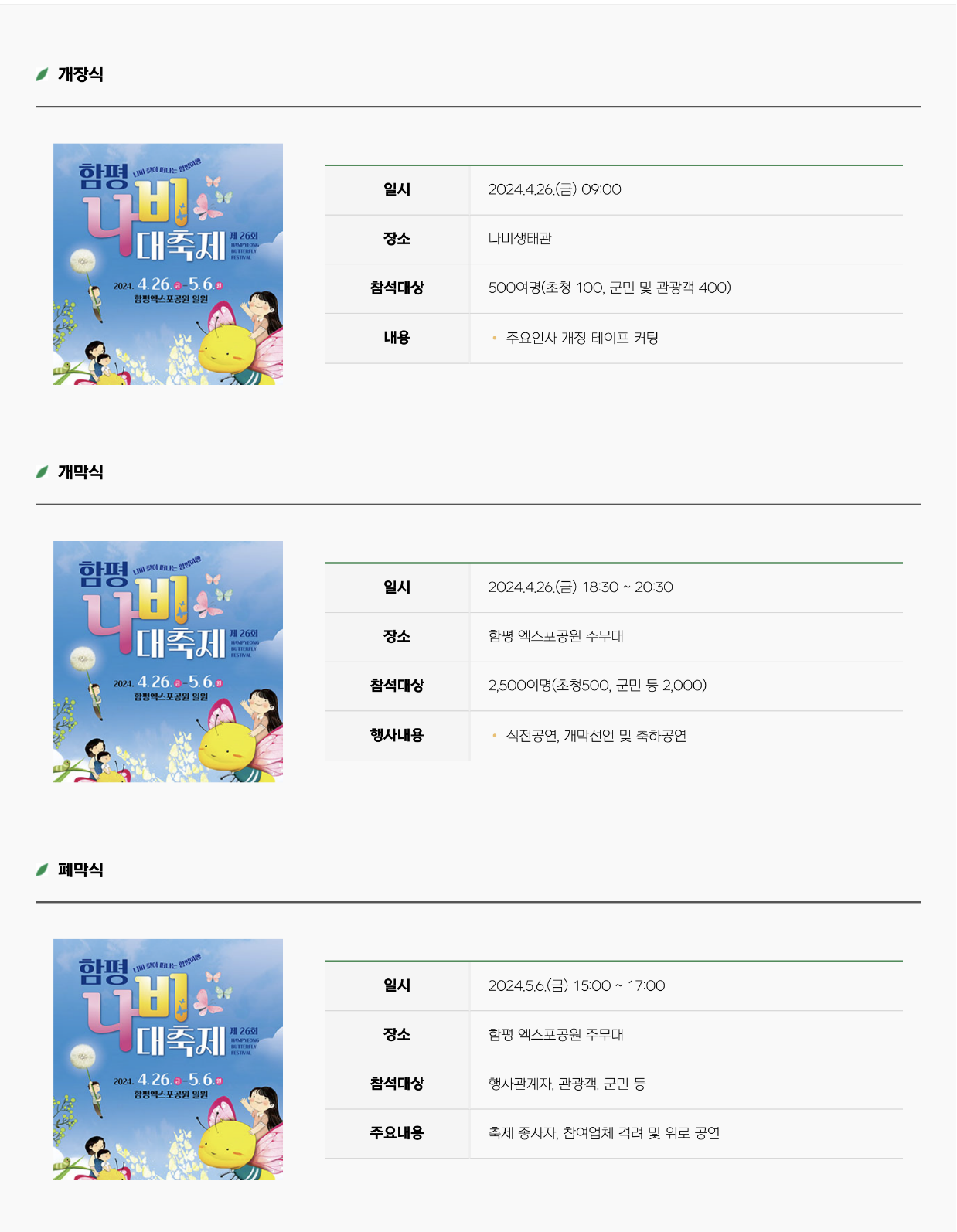전라남도 함평군에서 열리는 함평나비대축제가 이번 2024 4.26 ~ 5.6일까지 축제 행사가 진행됩니다. 행사일정 축제프로그램은 , 추차공간소개하도록 하겠습니다. 함평나비 대축제 축제일정 함평나비 대축제는 11일간 축제가 진행됩니다. 축제기간동안 진행하는 프로그램 체험 등등 소개하도록하겠습니다. 축제 기간 일시 : 2024. 4.26 ~ 2024. 5.6 장소 : 함평 엑스포공원 및 시가지 일원 시간 : 9시 ~ 18시까지 문의 : 061-320-2238 홈페이지👆️ 개막식 개장식. 페막식 일정 나비축제 입장권 금액 입장료는 위의 사진처럼 유료로 진행됩니다. 신청방법은 사전예약 ,으로 하시는걸 추천드립니다. 입장권 사전 현장 판매 제 26회 함평나비대축제 입장권 사전 현장 판매 or 인터넷 사전예매 기..